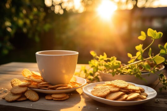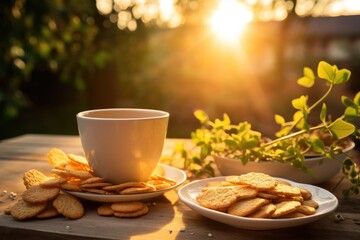 A plate of biscuit cookies and a cup of tea on a wooden table in garden at sunset.