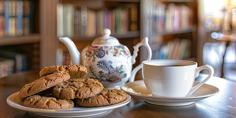 homemade ginger cookies sits beside an elegant teapot and cup on the table in front of you at a coffee shop or tea room, generative AI