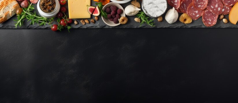 Assorted cheese and meat appetizers presented on a dark slate background with a side border and copy space.