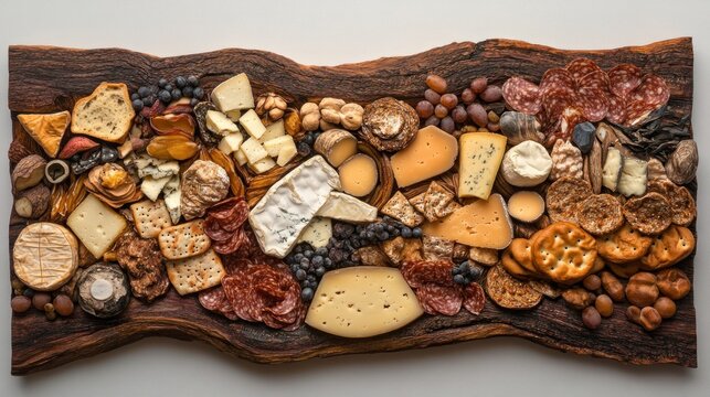 Rustic wooden board showcasing assorted cheeses crackers and salami
