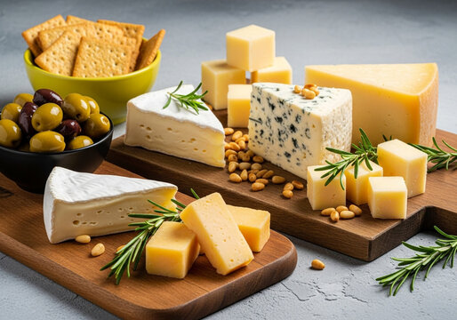 Assortment of cheese, crackers, olives, and nuts on boards