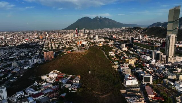 Drone shot circling a Mexican flag on top of the Bishopric Hill, in sunny Monterrey, Mexico