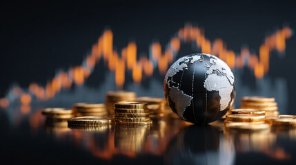Global economy concept image:  Black globe with silver continents sits amidst stacks of gold coins against a blurred orange graph background, symbolizing international finance and investment