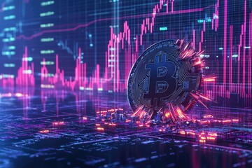 Cryptocurrency Crash: A bitcoin symbol breaks apart, amid glowing digital data of market decline, symbolizing the volatile and uncertain nature of digital finance
