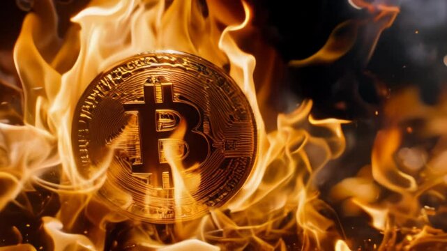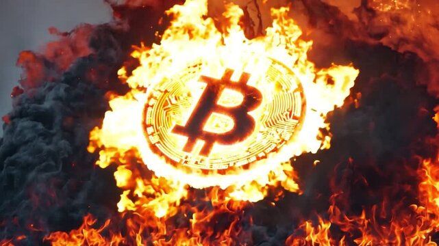 Fiery depiction of a Bitcoin coin set amidst flames, symbolizing crypto risk, volatility, and financial instability.