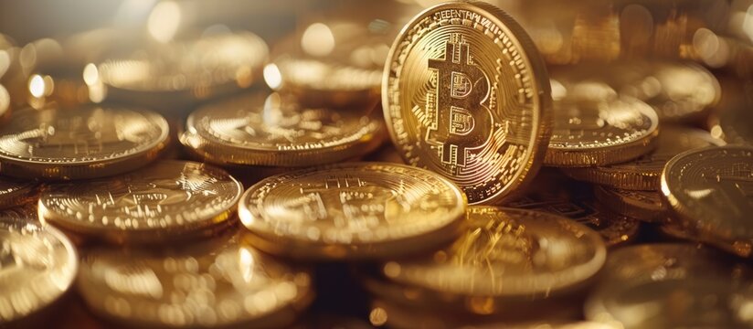 Golden Bitcoin coins stacked with blurred background