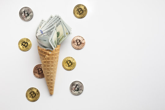 Shiny gold coins and bitcoin in mid-air with a blue background