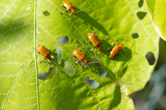 Orange colored leaf beetles on a East Asian arrowroot leaf.