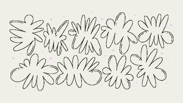 Collection of abstract shapes with y2k symbols and signs. Vector elements designed in retro brutalism style, monochromatic, black and white geometric objects with a bitmap pixel effect