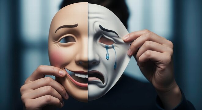Unmasking Emotions: A close-up of a person holding a theatrical mask depicting joy and sadness, expressing a profound duality of human emotions.