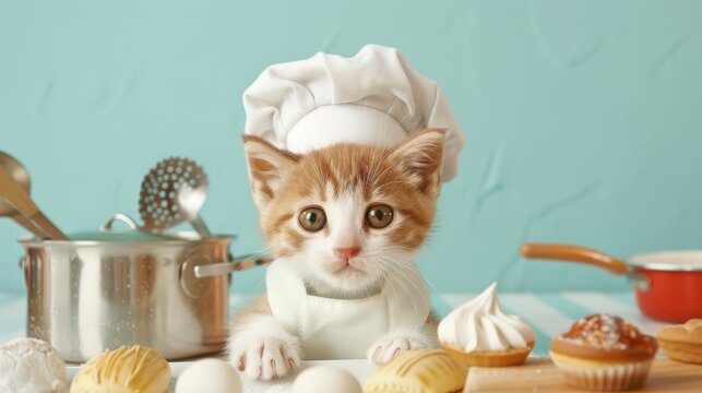Playful kitten art toy with big, adorable eyes, wearing a tiny chef's hat and apron, surrounded by miniature cooking utensils and pastries