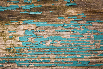 A plank of wood with flaky Turquoise paint