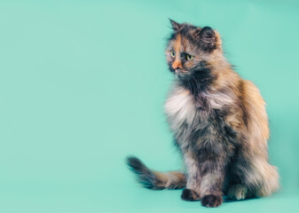 fluffy motley cat on a turquoise background
