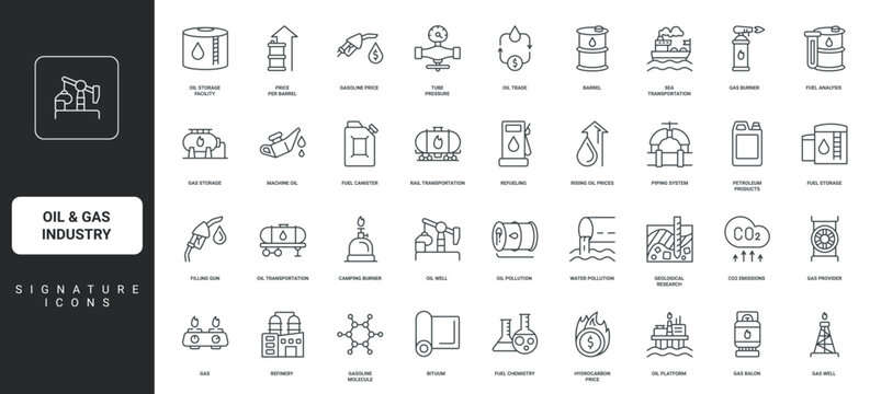 Well drilling and offshore platform, pump thin black outline symbols vector illustration. Oil and gas industry, barrel and tank for storage, refinery plant, fuel station line icon set.