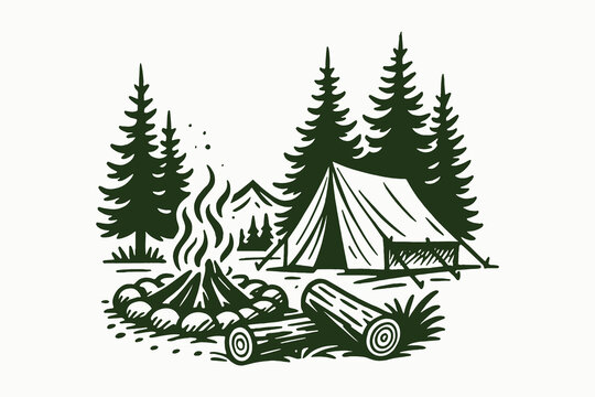 Forest campsite with tent and campfire, bold line vector illustration