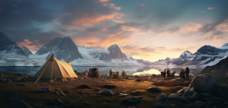 Sunrise view from a high-altitude bivouac with mountaineers preparing for the day's ascent. [Sunrise view from high-altitude mountaineering bivouac