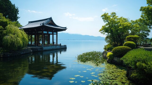 Tranquil waters and traditional Japanese architecture along the coast of Biwa Lake Japan