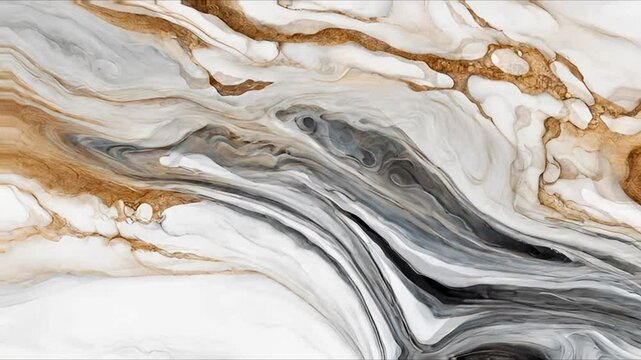 Abstract marble texture with flowing paint effect, elegant combination of white, gold and black colors, suitable for modern interior and graphic design backgrounds. 4k