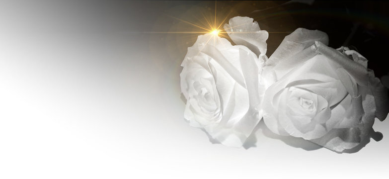 White roses on a white background with golden rays. Condolence card. Empty place for emotional, sentimental text or quote. Black and white image