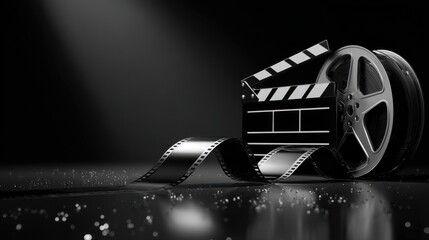 A sleek, glossy digital illustration with a luxury monochrome theme. A black-and-white film clapperboard with a glossy finish and sharp angles is set on the left,
