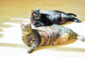 床暖房きいたフローリングの部屋で寝転がって日向ぼっこする二匹の飼い猫