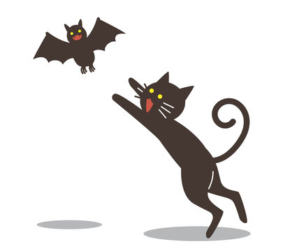 Black cat sits alone in japanese garden under cherry blossoms trees at night. Fuji mount, moon, traditional houses with water reflection create magical landscape. Cute anime cartoon animal art