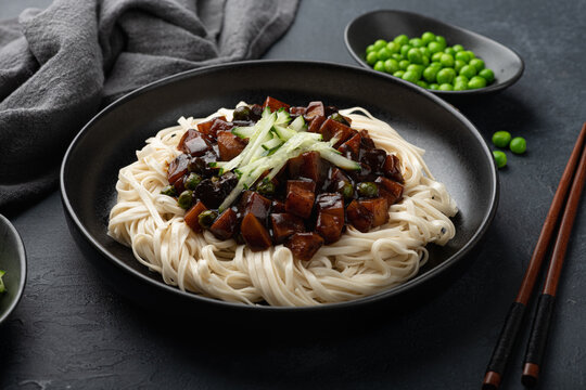 Jajangmyeon, black bean noodles in a black ceramic plate , selective focus