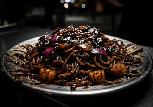 Top view of Korean noodles with black bean sauce on a dark backdrop