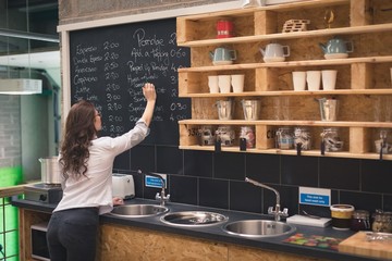 Female owner writing a menu on black board