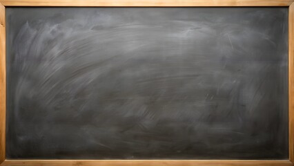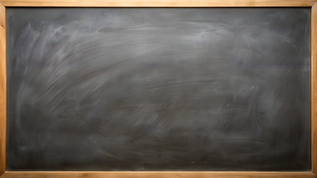 Dark black textured chalkboard with white chalk stains in the aged wooden frame. Grunge blackboard texture wallpaper design. Dirty black board wall background.