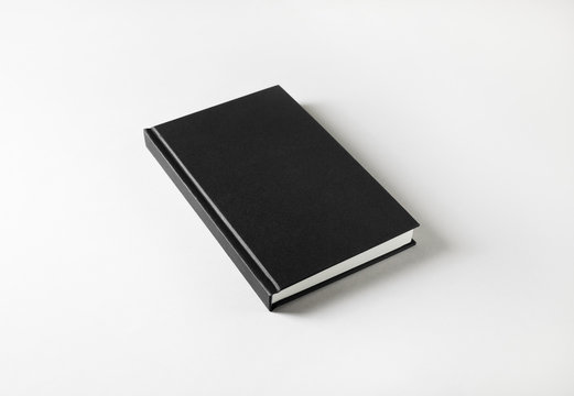 Blank black book cover on white paper background.