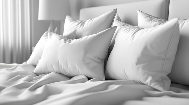 3D rendering of a pile of monochrome pillows on the edge of a bed