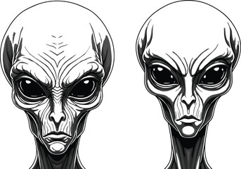 Detailed vector illustration of two gray alien heads with black eyes isolated on white background for sci-fi halloween design.