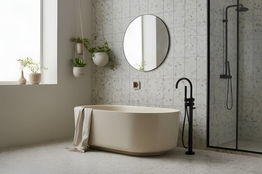 Serene Spa Retreat: A minimalist bathroom features an inviting freestanding bathtub with a sleek black faucet, encircled by natural light, embodying a tranquil spa experience.