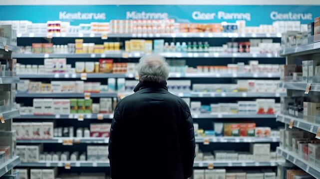 A man with white hair and a black jacket stands in a pharmacy aisle, his back to the camera, looking at the shelves filled with various products.