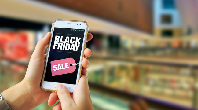 Black Friday. Girl in a Shopping Mall holding a smartphone with a Black Friday advertising on the screen. Marketing, ecommerce, cell phone publicity.
