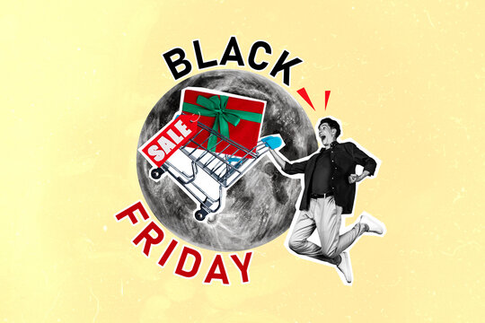Creative contemporary collage of funny young man jump air buy gifts at supermarket black friday fly to moon isolated on yellow background