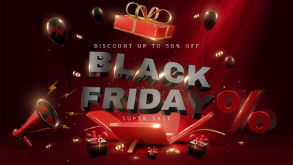 Black Friday sale background with bold text Decorated with black balloons, gift boxes and gold ribbons on a red background, red elegant backdrop for holiday sale promotion.