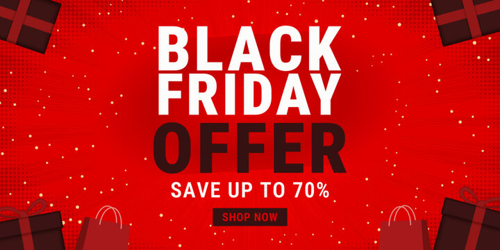Bold Black Friday offer banner with large white and black text on a vibrant red background, decorated with gift boxes, sparkles, and shopping elements.