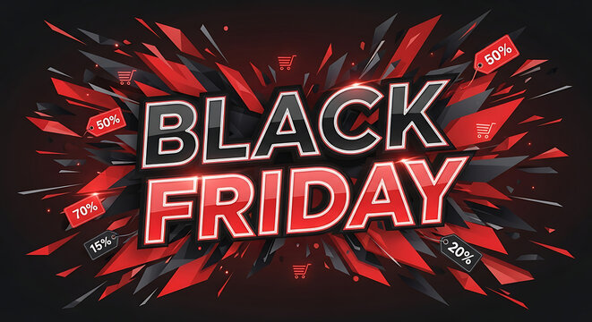 Explosive Black Friday sale graphic with discount tags and shattered elements.