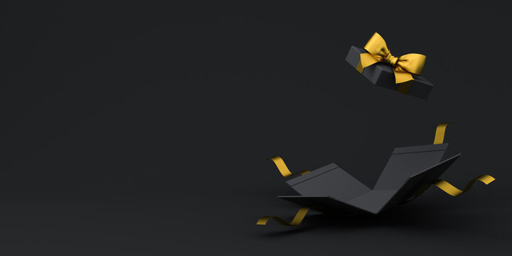 Blank open black gift box or opened black present box with golden ribbons and bow isolated on dark black background with blank space minimal black friday sale conceptual 3D rendering