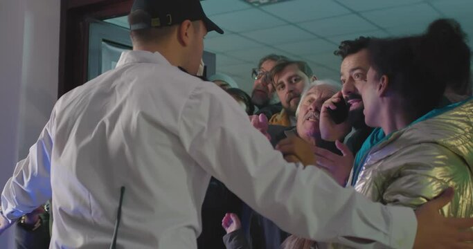 Security guard trying to hold crazy crowd in shop entrance