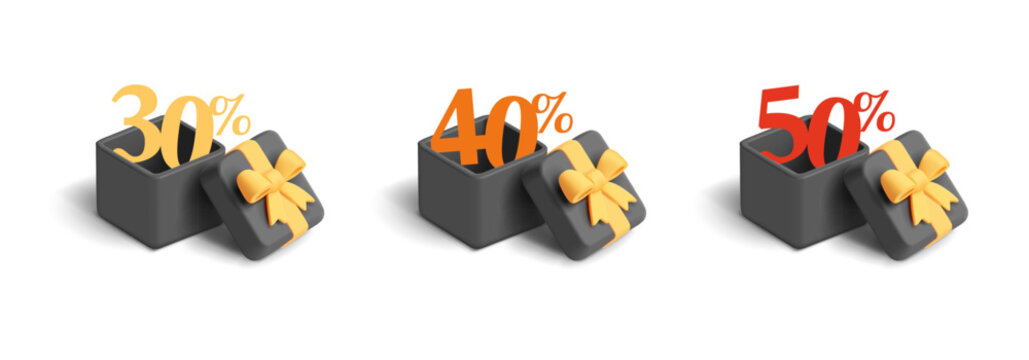 Set of black 3D open gift boxes with discounts inside. Elements on white background for concepts of Black Friday, discounts, sales, promotional offers. Vector illustration.