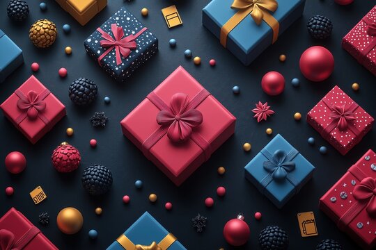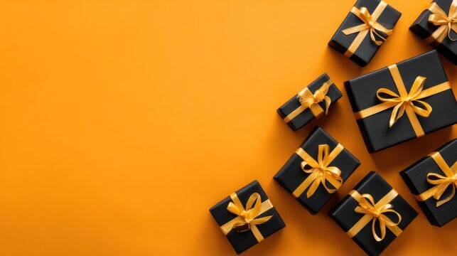 Vibrant and festive gift boxes arranged for promotional Black Friday sales. Ideal for marketing materials showcasing seasonal shopping deals and discounts.