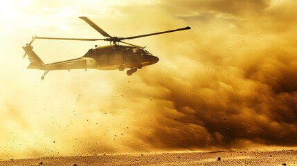 A black hawk helicopter flies through a dense dust storm, creating a dramatic silhouette against the golden sky