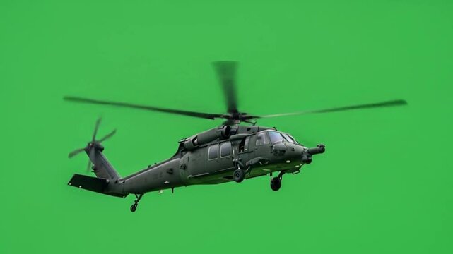 A black hawk helicopter with rotating blades flying against a solid bright green background in the sky