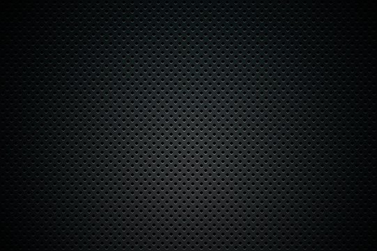 Perforated metal. Dark sheet plate with perforation holes, black metallic vector background