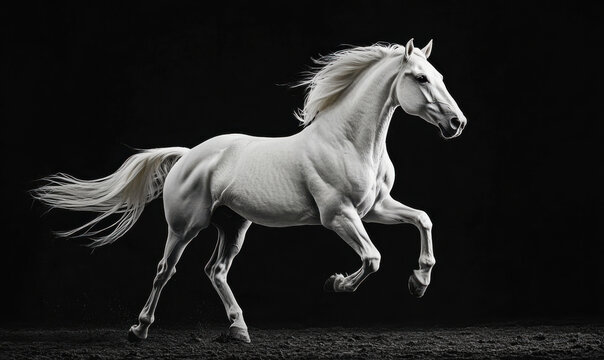 Galloping black horse kicking up dust in motion. Dynamic studio action shot. Strength and speed concept. Design for poster, wallpaper, banner.