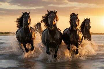 AI generated illustration of a herd of black horses running in the sea at sunset