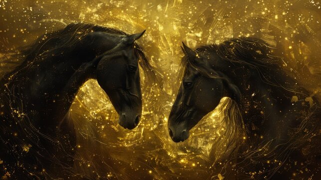 Two Majestic Black Horses Facing Each Other Against a Dazzling Golden Background.